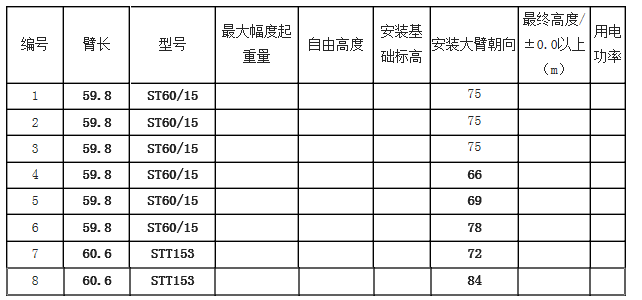 (4)数量:本工程共设8台塔吊,塔吊租赁招标数量及技术参数如下: