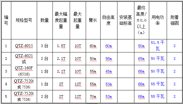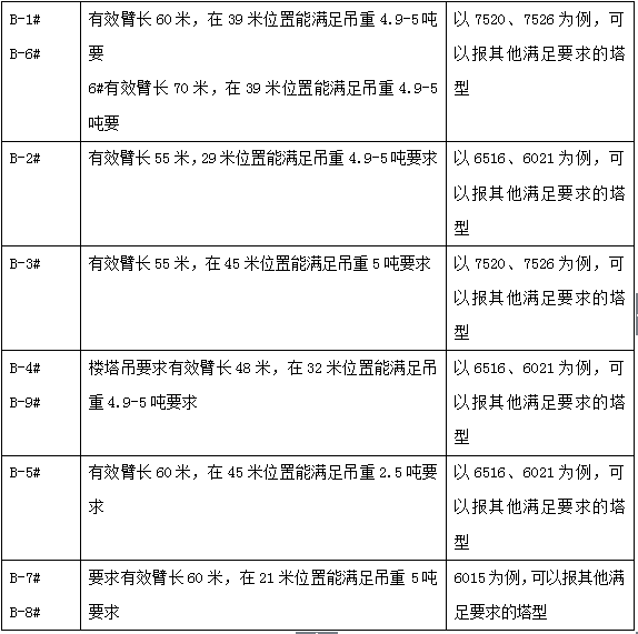 (4)数 量:本工程需要9台,塔吊租赁招标数量及技术参数如下: