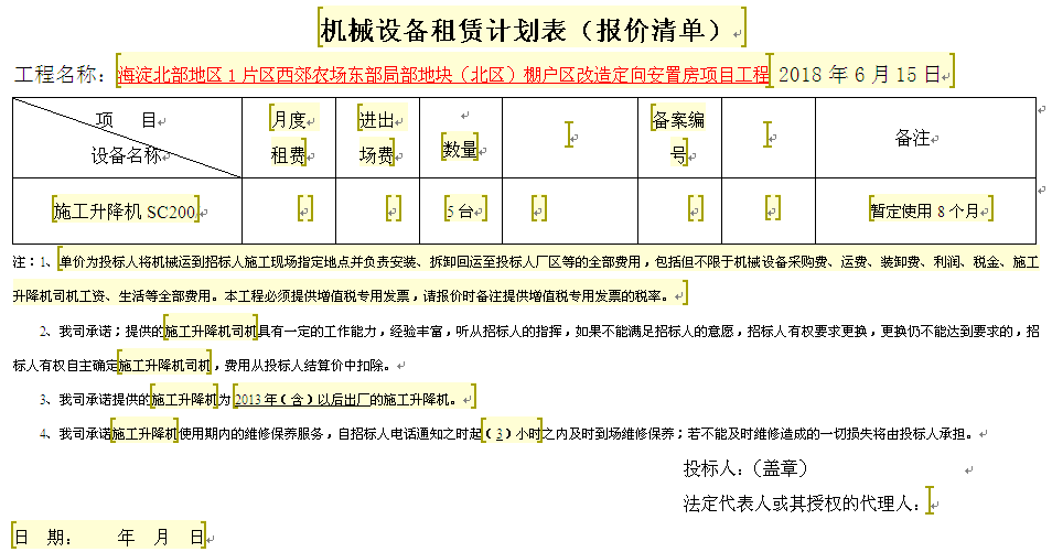 五、付款方式及时间:投标人每月与招标单位项目部机械设备负责人办理对帐签认手续,每月付上月租赁费的70%,施工完毕设备拆除退场,办理结算后一个月内付清余款。