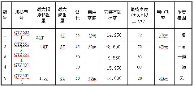 (4)数 量: 5 ,型号为:一台QTZ6021、三台QTZ5518、一台QTZ5015 塔吊租赁招标数量及技术参数如下: