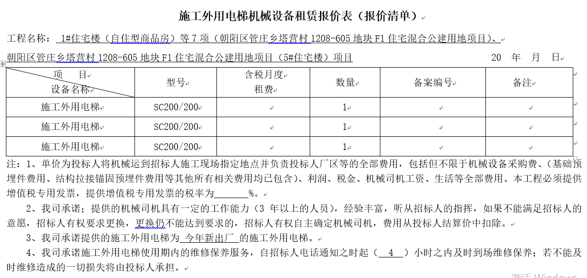 附件:施工外用电梯机械设备租赁报价表(报价清单)