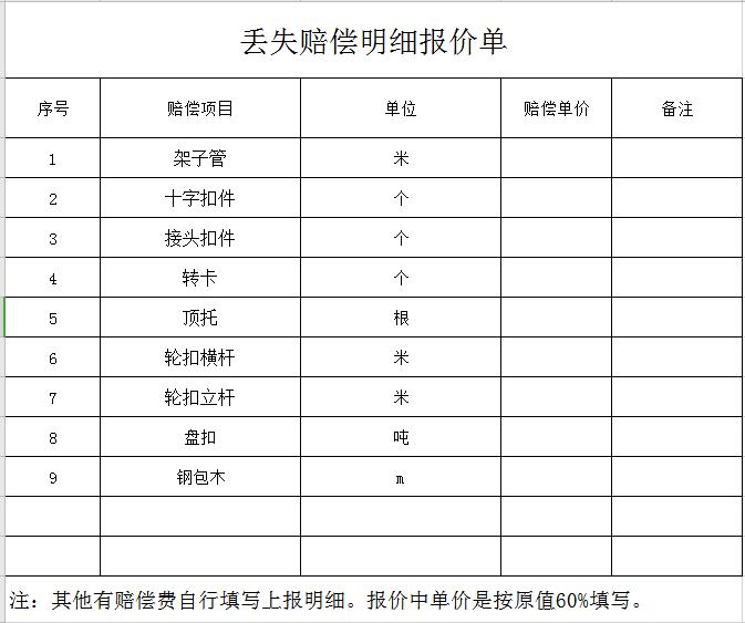附件二:丢失赔偿明细报价单(报价开始前需上传到平台系统后台)