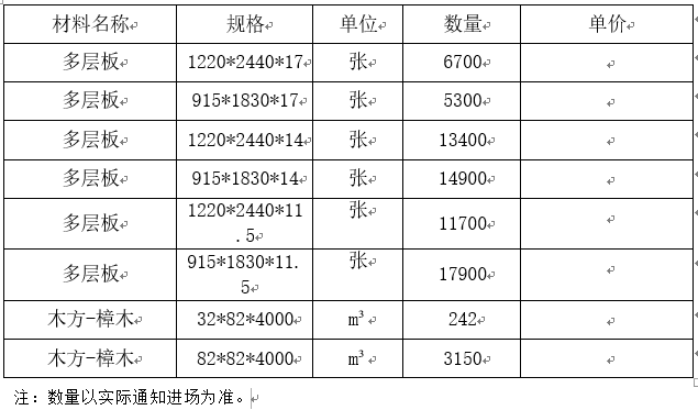质量要求:方木(规格:32mm*82mm*4000mm;82mm*82mm*4000mm);多层板(规格:1220mm*2440mm*18mm或15mm或12mm)周转3次以上。