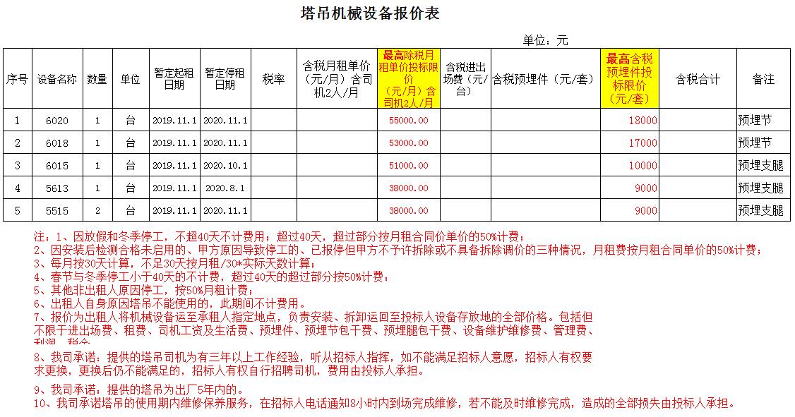 (3)设备要求:6020一台;6018一台;6015一台;5613一台;5515两台。以上塔吊优先选用选出厂使用5年以内的。说明:塔吊型号前两位为臂长,后两位为末端其重量,施工现场由于实际需求,塔吊存在截臂施工)
