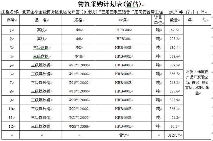 北京城建远东3100吨钢筋集采公告北京城建远东建设投资集团有限公司就北京丽泽金融商务区北区菜户营(D地块)“三定三限三结合”定向安置房工程将于2017年12月5日通过兰格云商集采平台进行钢筋招标,有供货实力的客户请登 jc.lange360.com 查看项目详情下载招标文件并及时联系兰格云商办理相关手续,获取投标资格。