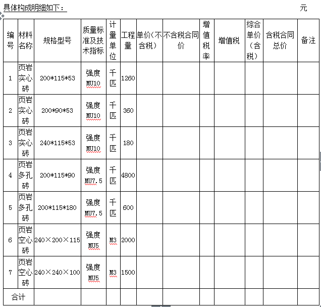 (3)数 量:页岩实心砖1800千匹、页岩多孔砖5400千匹、页岩空心砖3500m3。