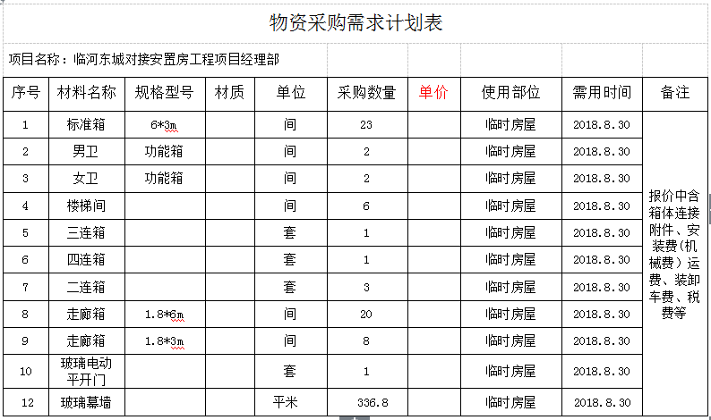 五、报价方式:报价中含箱体连接附件、安装费(机械费)、运费、装卸车费、税费等,不再单列报价。