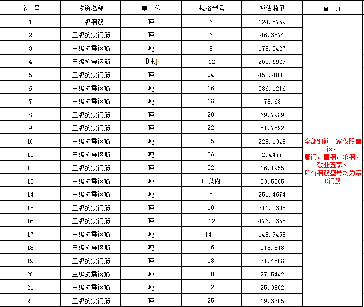 (4)要求品牌:全部钢筋厂家仅限首钢,唐钢,宣钢,承钢,敬业五家