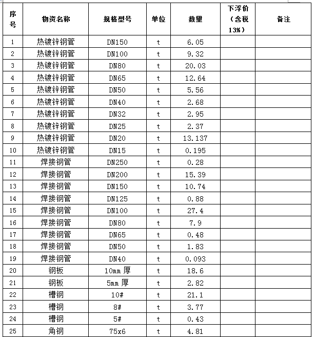 (1)招标货物名称:热镀锌管、焊接钢管、型钢