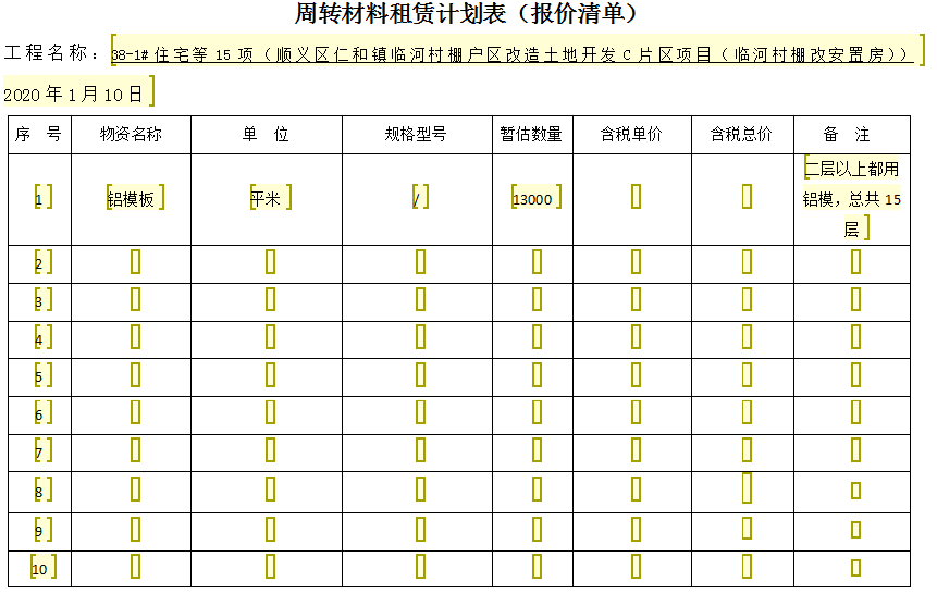 1.报价按统一混凝土的粘灰(铝模板与混凝土接触部分的面积)面积XX 元/平方米计算(含税价),不按铝模的展开面积计算。租赁期限2020年3月20日至2020年8月19日(暂定)共计150天,超过部分单独报价。