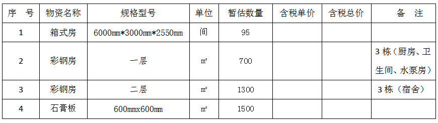 (3)数量:箱式房95间、彩钢房2000㎡、石膏板吊顶1500㎡。